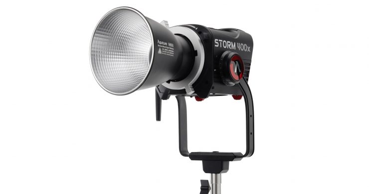 The Aputure STORM 400x is a compact, 400W tunable-white point source LED monolight designed for professional film and TV production, featuring a full-spectrum BLAIR chipset and an IP65 weather-resistant build.